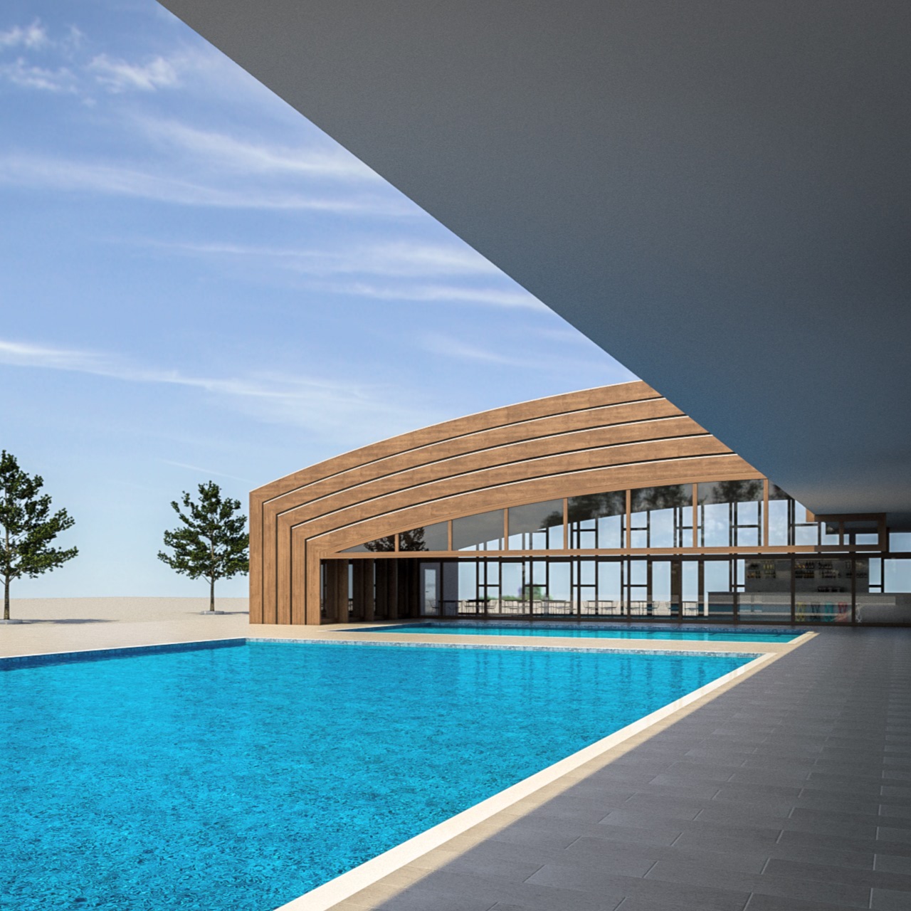 abbiamo sviluppato questa proposta di impianto natatorio completo, sulla base delle esigenze reali espresse dai vari gestori di piscine nel corso del tempo; aree dimensionate correttamente per piccole realtà, coibentazione massima e impianti performanti per ridurre i costi di gestione all'osso; vasca nuoto da 6/8 corsie e vasca di ambientamento o riabilitativa in testa, sempre coperta anche d'estate con parete trasparente del bar adiacente adibito a saletta "mamme" durante i corsi; spogliatoi, reception, uffici ricavati e dimensionati nel volume adiacente la vasca convertibile; strutture in lamellare e clt per entrambi i fabbricati; in poche parole, quello che serve per lavorare al meglio; una nota tecnica: durante le stagioni di mezzo, la trasparenza della copertura genera un enorme effetto serra a tutto vantaggio dei costi di riscaldamento,durante la stagione estiva, gli impianti di trattamento aria sono spenti perchè l'involucro è aperto; una condizione di assoluto vantaggio rispetto ad un impianto tradizionale, senza considerare che il pubblico d'estate predilige piscine scoperte per trascorrere week end di relax.