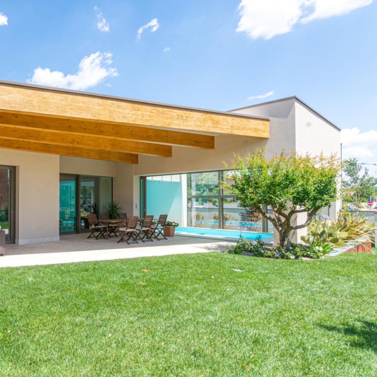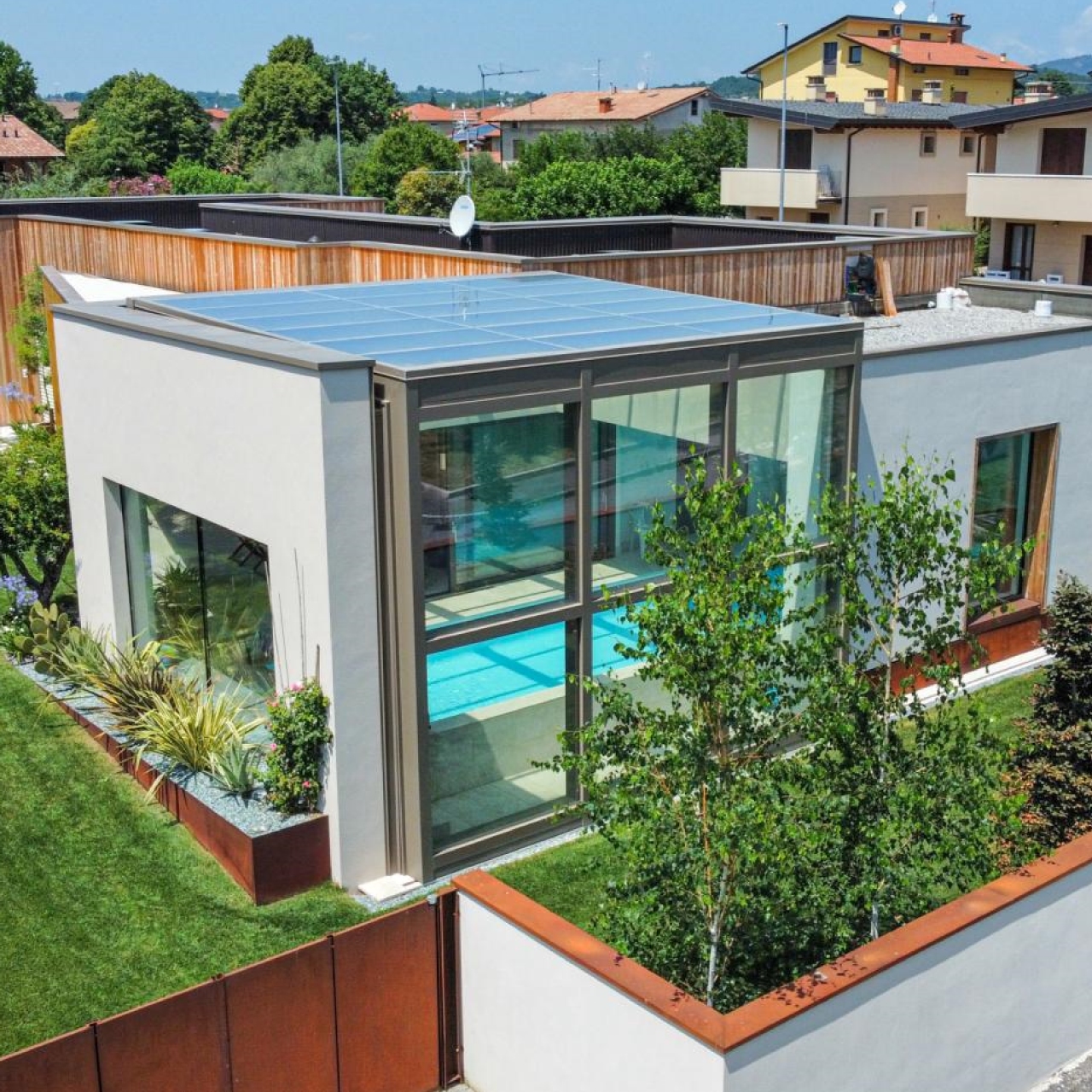 copertura mobile con strutture in alluminio coibentato e rivestimento in triplo vetro, adatta ad una abitazione certificata classe A CasaClima.