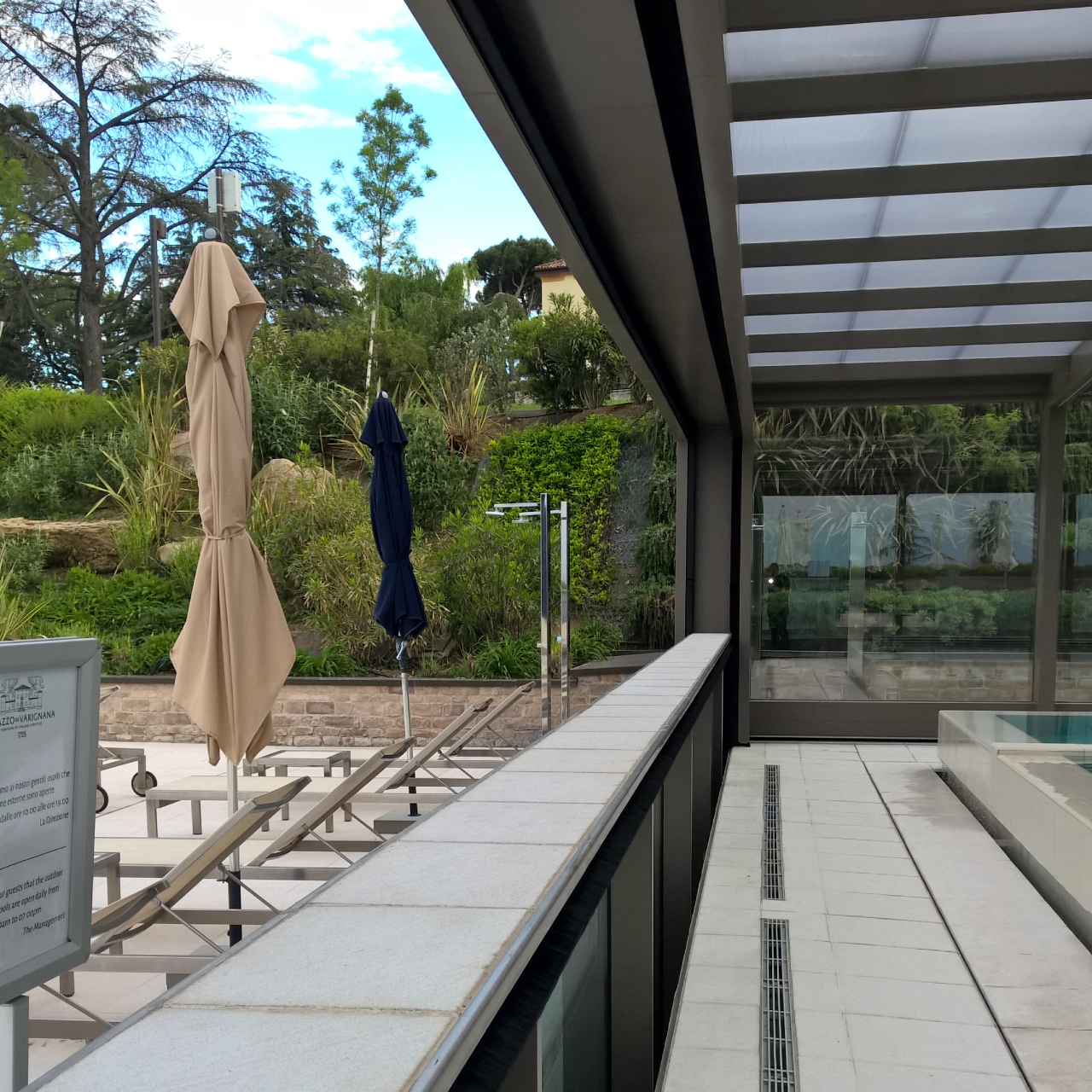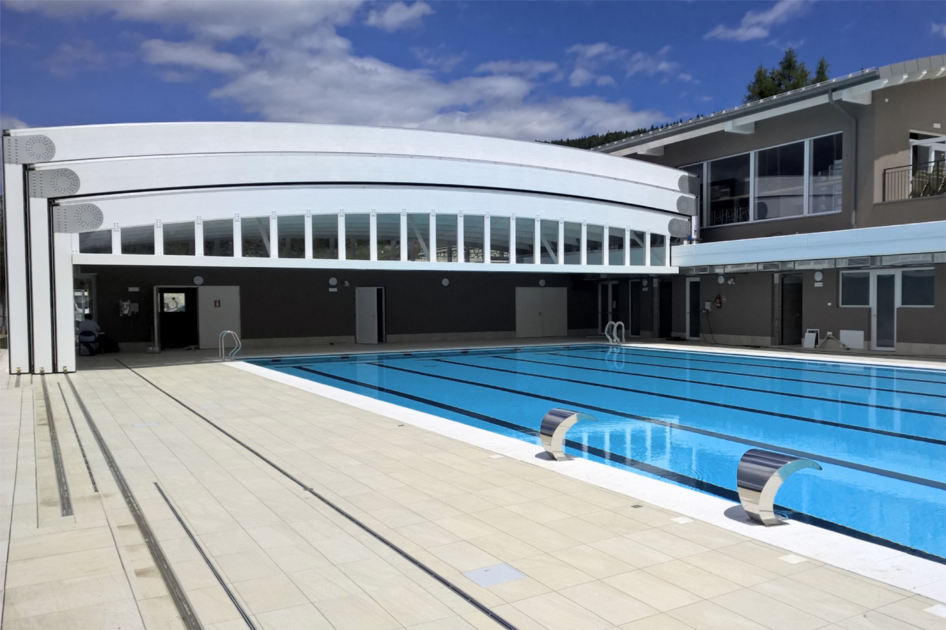 questa pregevole realizzazione sulle colline bolognesi rappresenta il nuovo approccio alla copertura mobile con strutture in alluminio a taglio termico; un vero involucro performante e confortevole dotato di illuminazione a bordo e sistema di illuminazione di emergenza con soccorritore automatico.