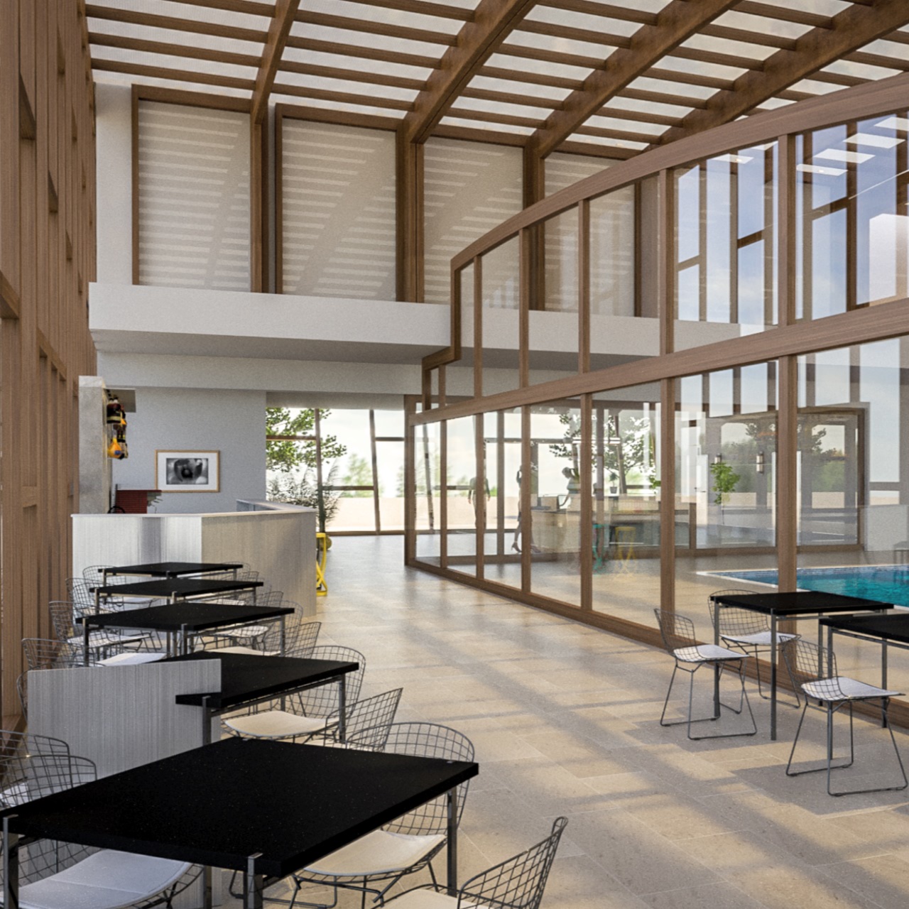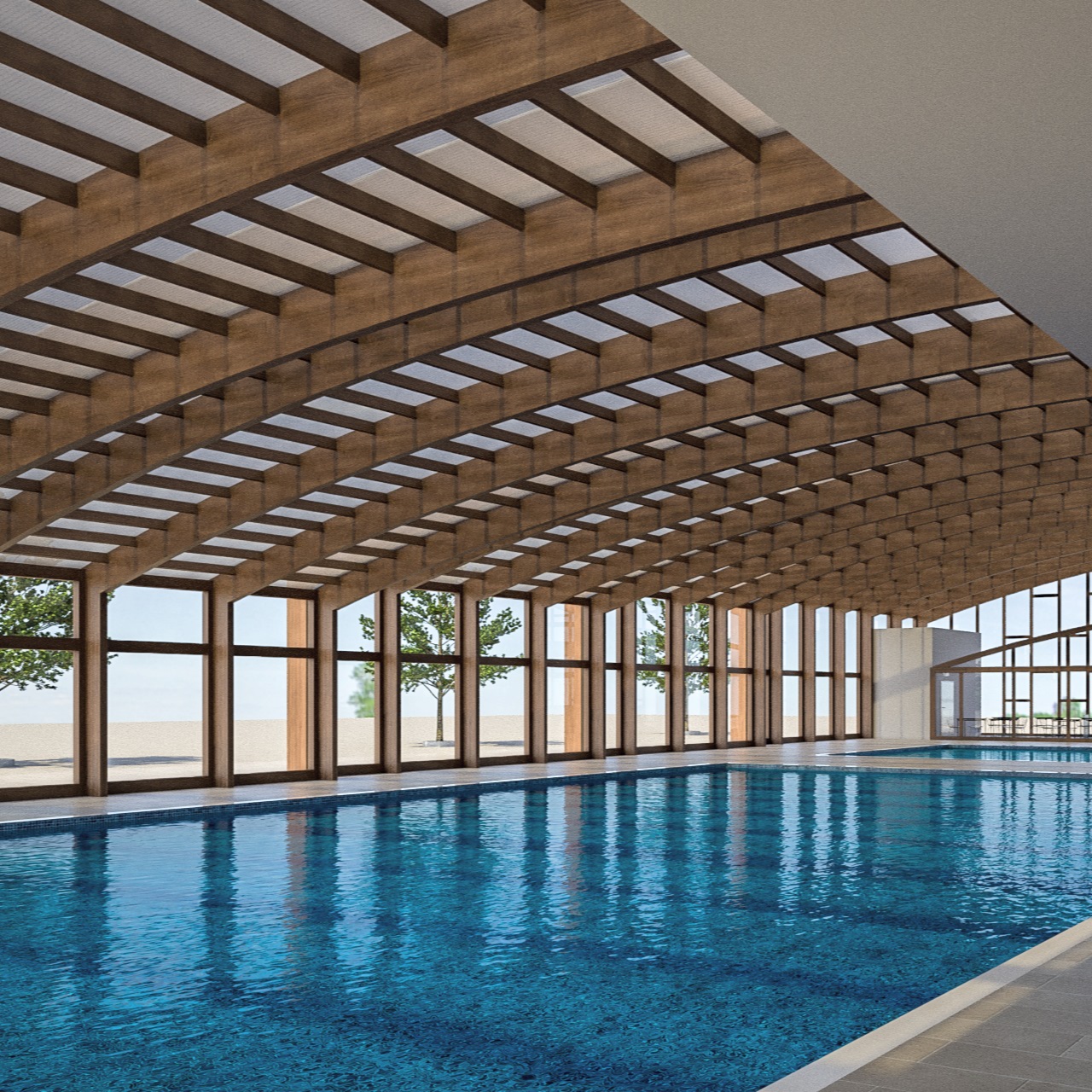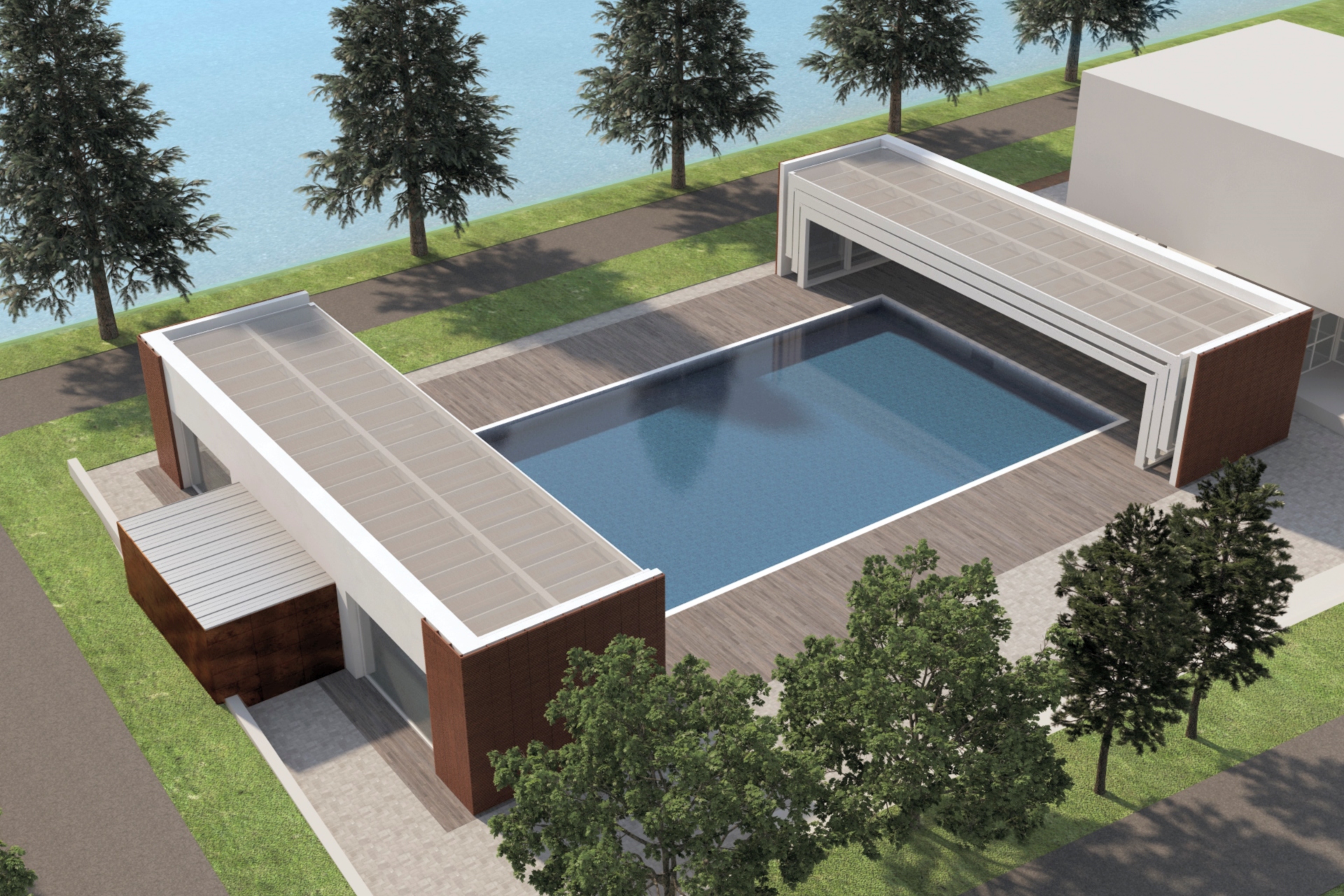 abbiamo sviluppato questa proposta di impianto natatorio completo, sulla base delle esigenze reali espresse dai vari gestori di piscine nel corso del tempo; aree dimensionate correttamente per piccole realtà, coibentazione massima e impianti performanti per ridurre i costi di gestione all'osso; vasca nuoto da 6/8 corsie e vasca di ambientamento o riabilitativa in testa, sempre coperta anche d'estate con parete trasparente del bar adiacente adibito a saletta "mamme" durante i corsi; spogliatoi, reception, uffici ricavati e dimensionati nel volume adiacente la vasca convertibile; strutture in lamellare e clt per entrambi i fabbricati; in poche parole, quello che serve per lavorare al meglio; una nota tecnica: durante le stagioni di mezzo, la trasparenza della copertura genera un enorme effetto serra a tutto vantaggio dei costi di riscaldamento,durante la stagione estiva, gli impianti di trattamento aria sono spenti perchè l'involucro è aperto; una condizione di assoluto vantaggio rispetto ad un impianto tradizionale, senza considerare che il pubblico d'estate predilige piscine scoperte per trascorrere week end di relax.