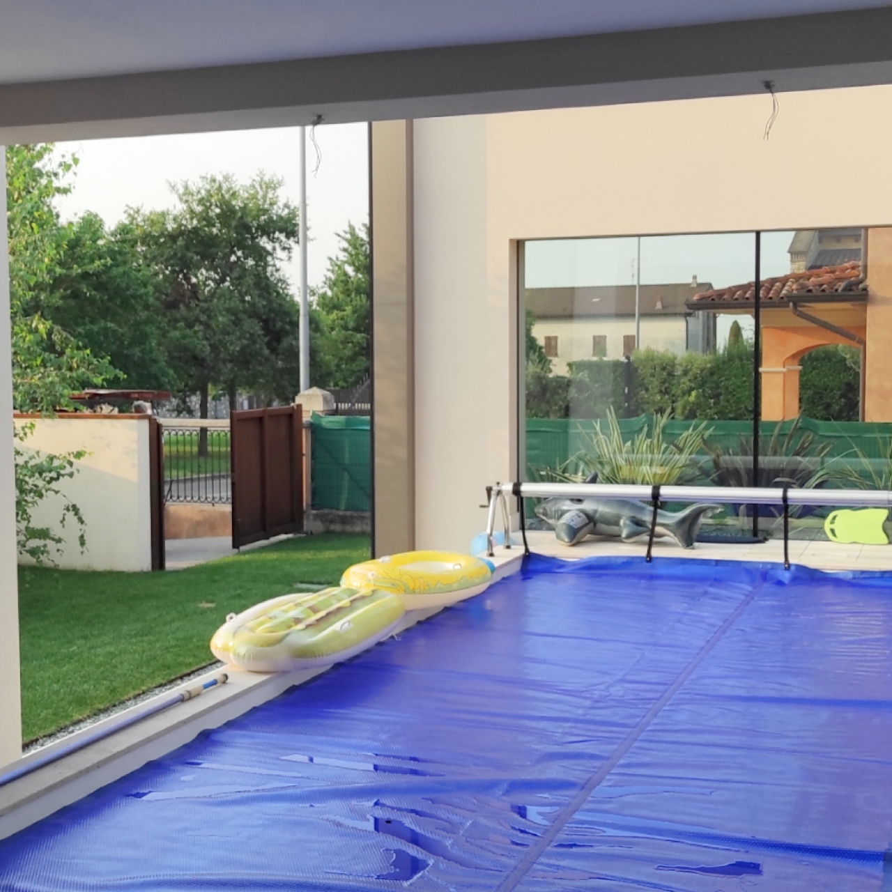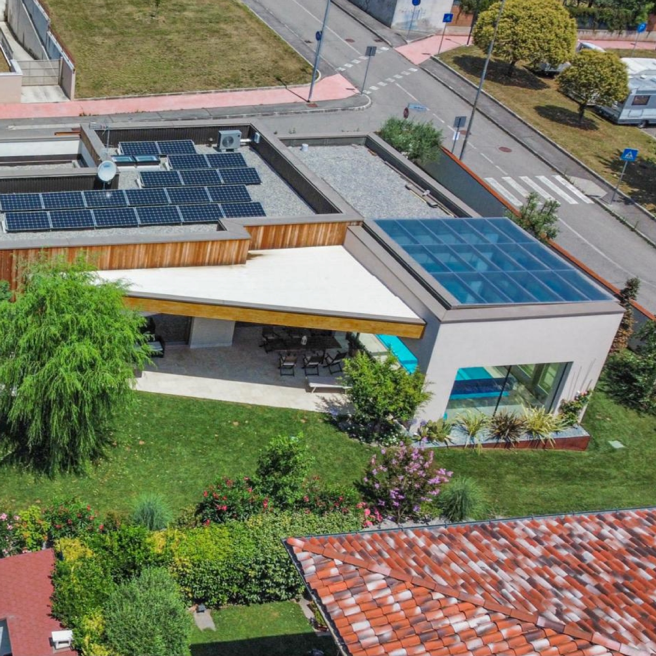 copertura mobile con strutture in alluminio coibentato e rivestimento in triplo vetro, adatta ad una abitazione certificata classe A CasaClima.